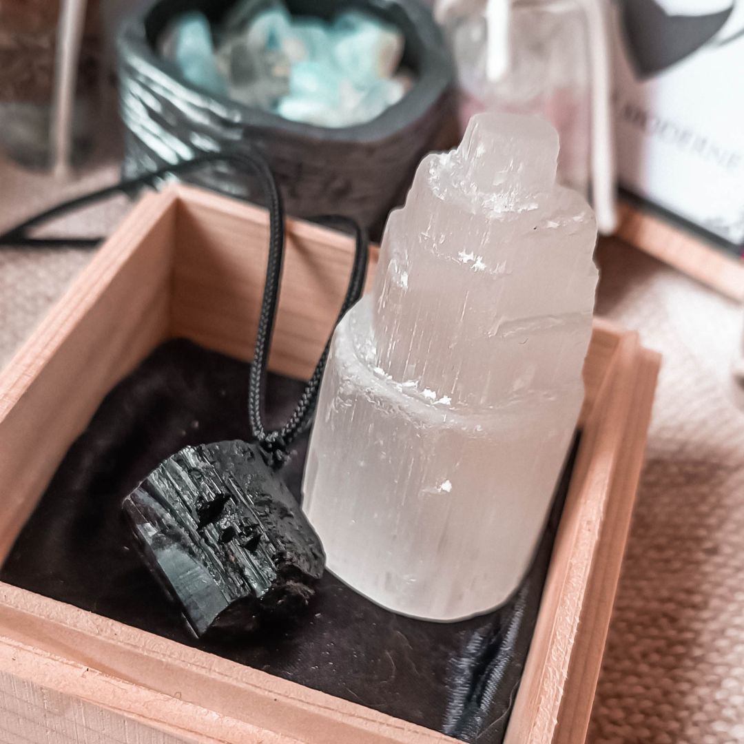 La Tormalina Nera e la Selenite formano una coppia perfetta, un’alleanza di luce e protezione. Durante il giorno, la Tormalina Nera agisce come uno scudo energetico: assorbe, respinge e trasforma le energie negative, mantenendoti centrata e al sicuro. Di notte, entra in scena la Selenite: con la sua vibrazione luminosa, purifica e ricarica non solo te, ma anche la Tormalina, liberandola dalle energie accumulate.