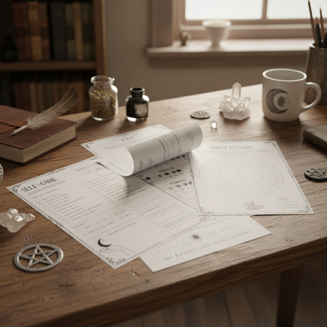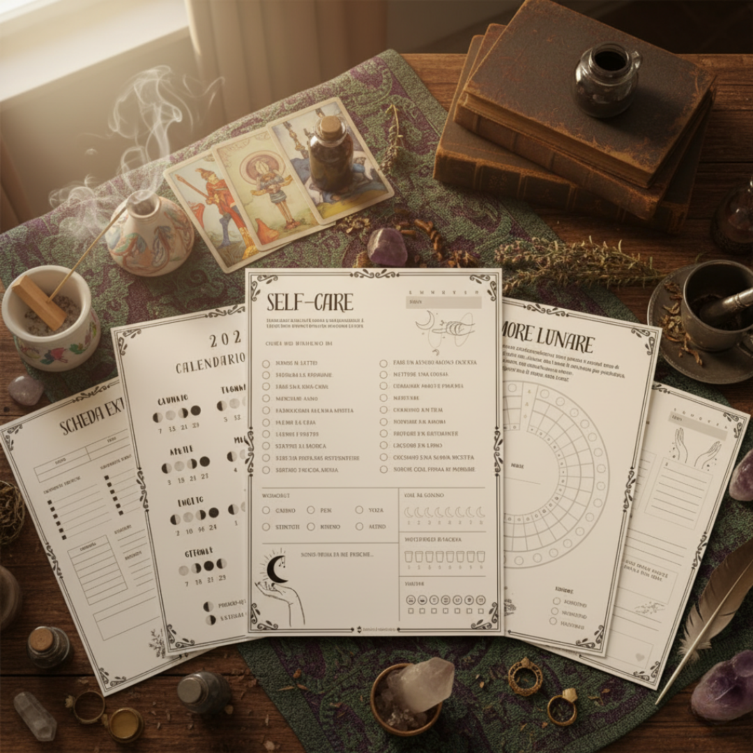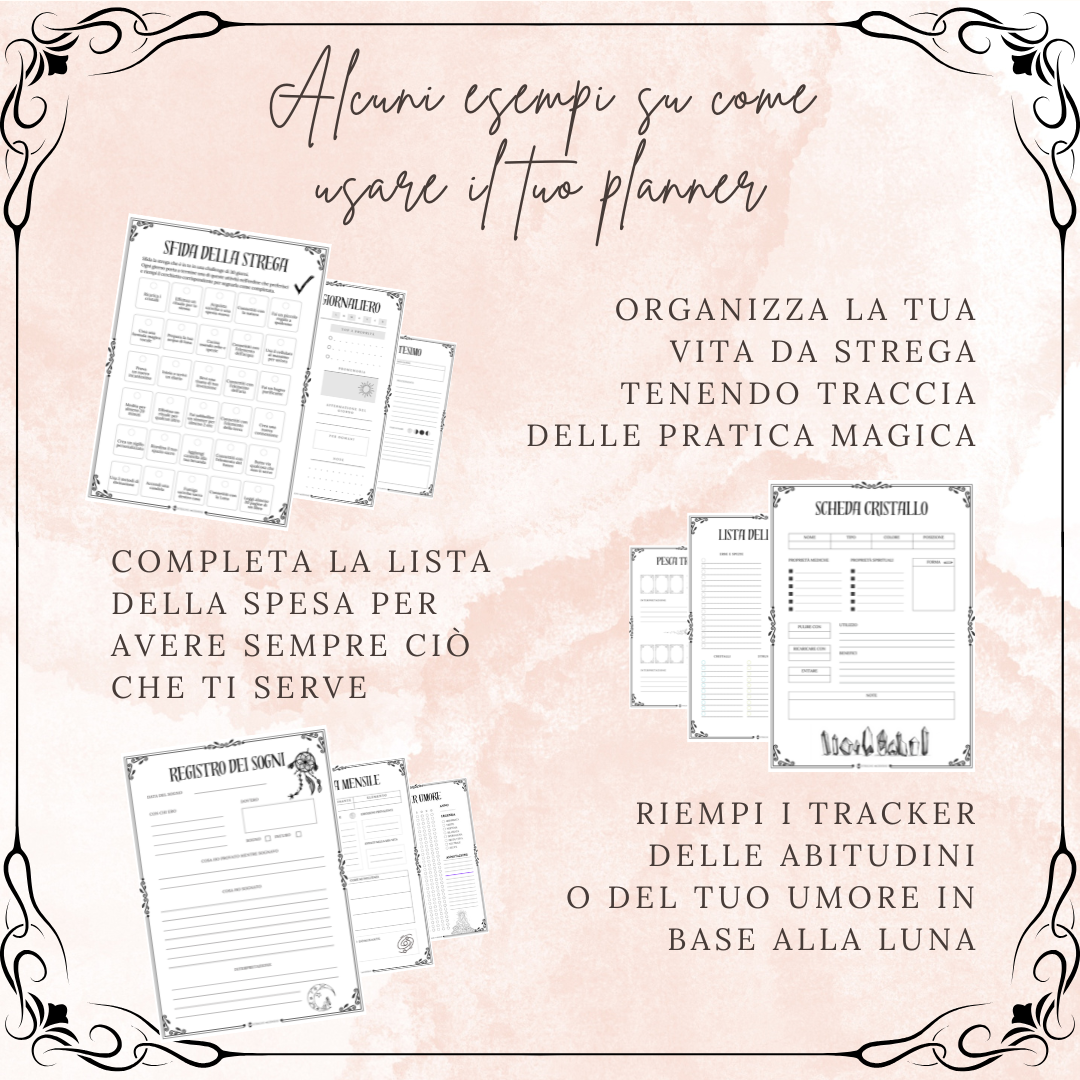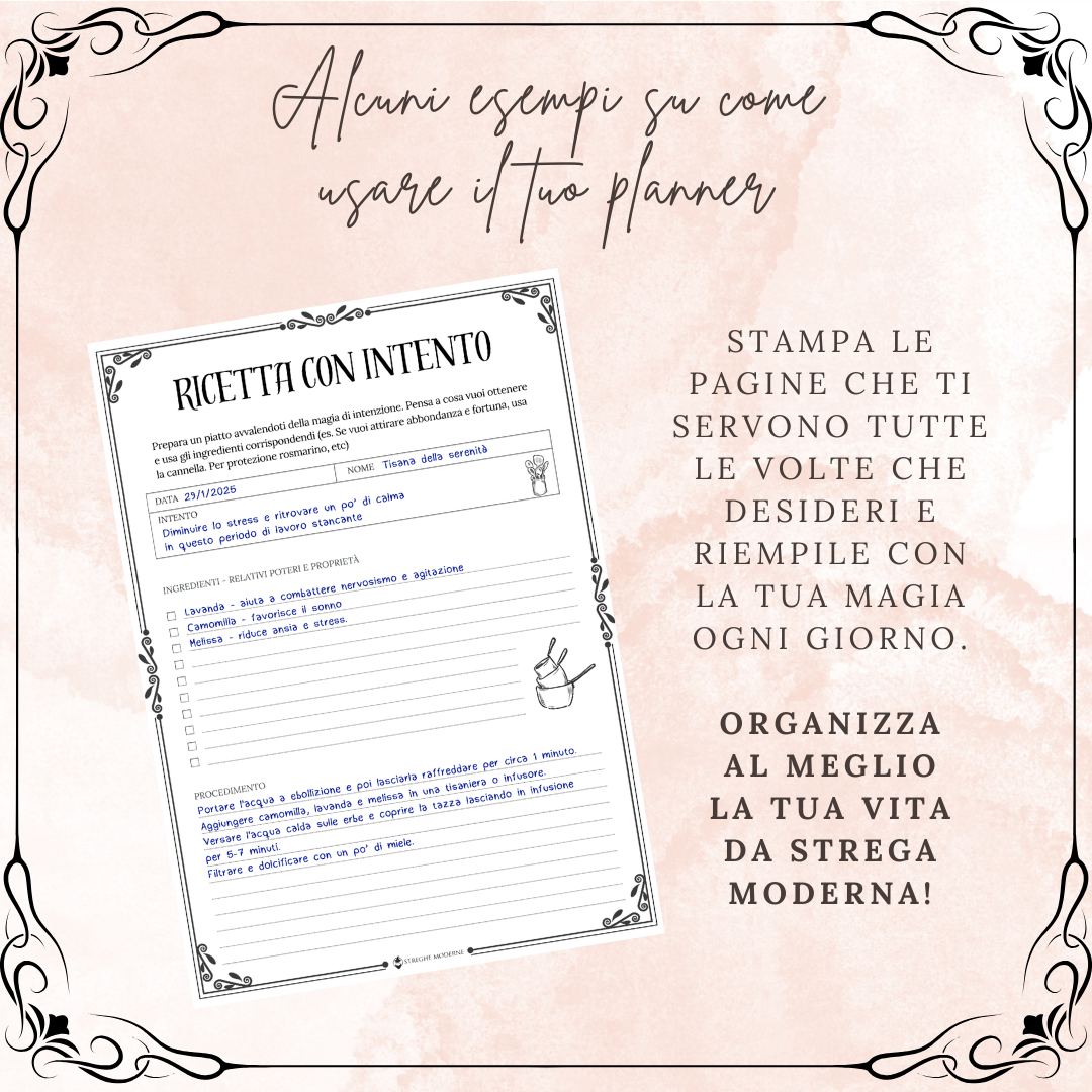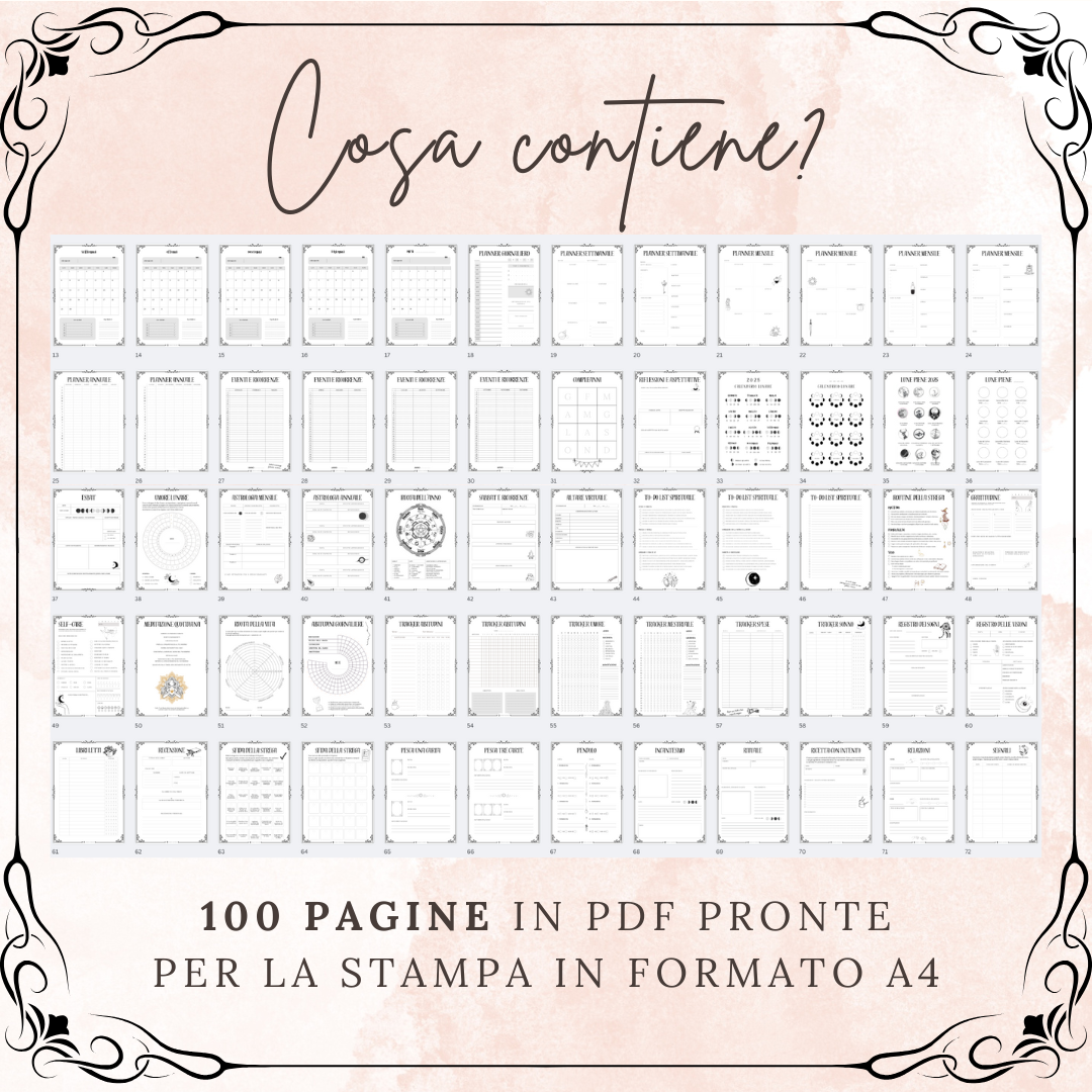 Questo Planner è pensato per tenere traccia di tutto ciò che riguarda la tua pratica magica. Si tratta di un file in PDF di 100 pagine (escluse le copertine) pronte per essere stampate in formato A4. Ecco alcune delle sezioni che troverai nel tuo planner: