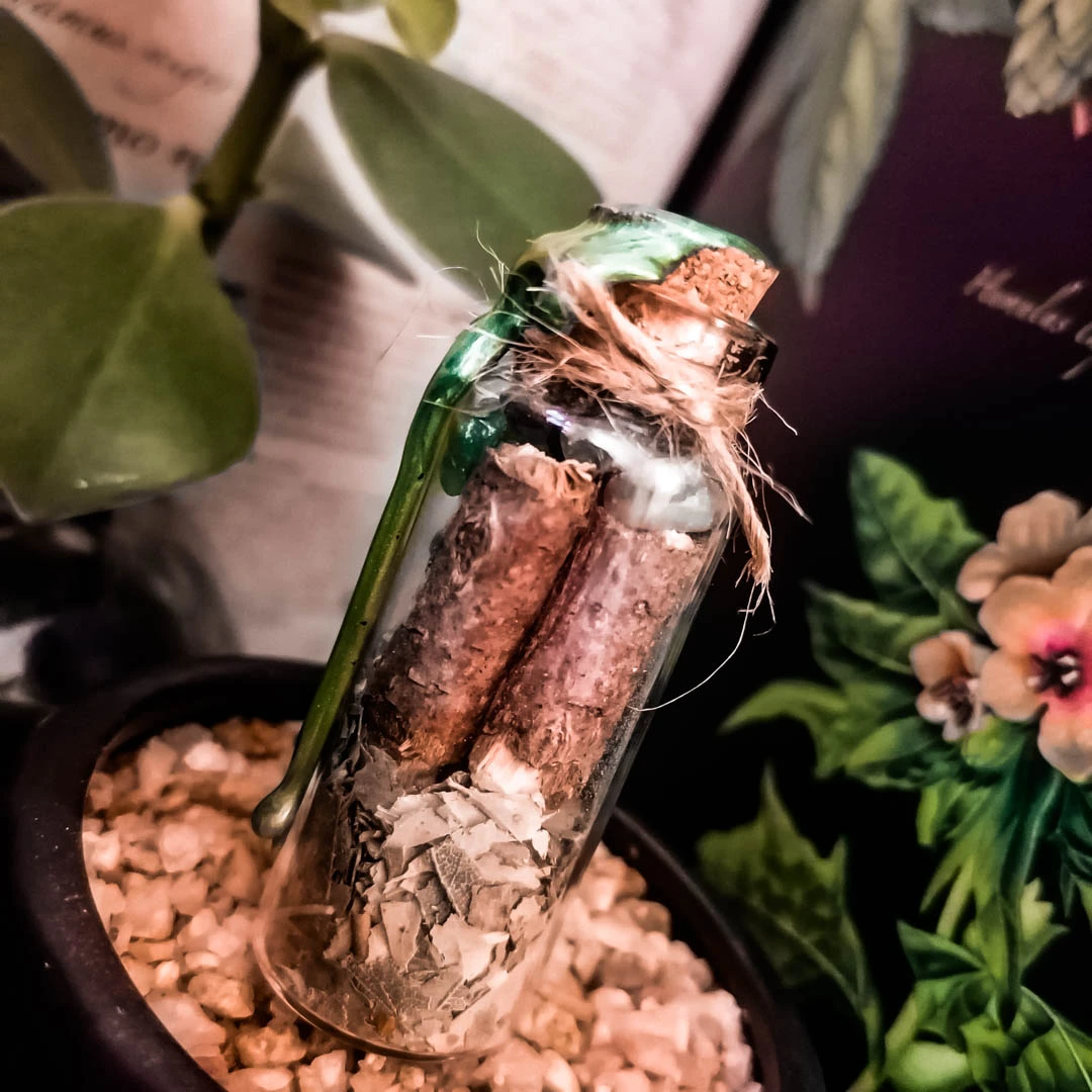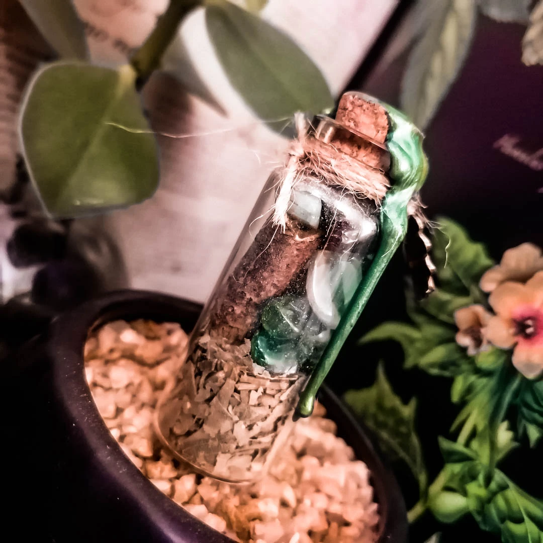 Il legno di conifera (in questo caso pino) rappresenta la forza e la resistenza. Agisce come uno scudo magico, conferendo resilienza e protezione contro le influenze negative della vita urbana. La sua presenza nella boccetta sostiene la strega, consentendole di affrontare le sfide quotidiane con coraggio. - Agata Verde