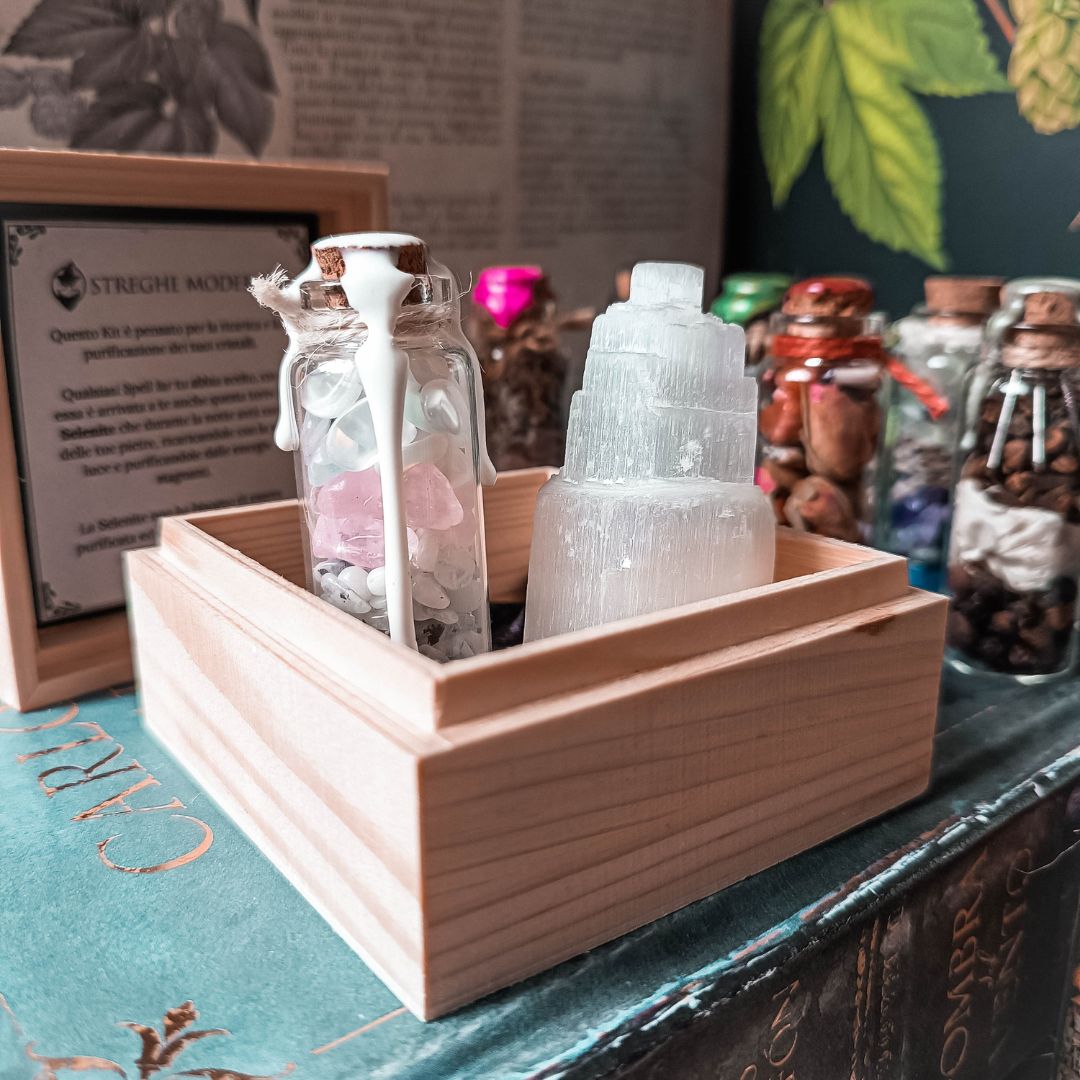 Puoi anche acquistare il BOX PURIFICAZIONE con Selenite, una pietra legata fortemente alla Luna e che lavora ottimamente con la Spell Jar Luna Piena.