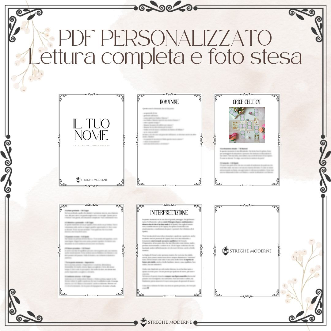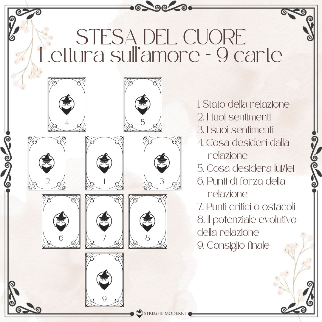 Questa lettura di 9 carte, disposte a forma di cuore, esplora in profondità i sentimenti, i desideri, i punti di forza e le sfide in una relazione. Che si tratti di un amore nascente, complicato, a distanza o di una storia che porta con sé tanti interrogativi, questa stesa ti aiuta a guardare tutto con più chiarezza e verità.